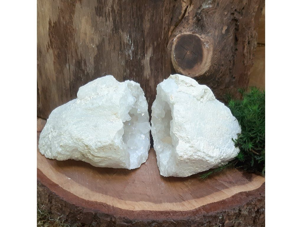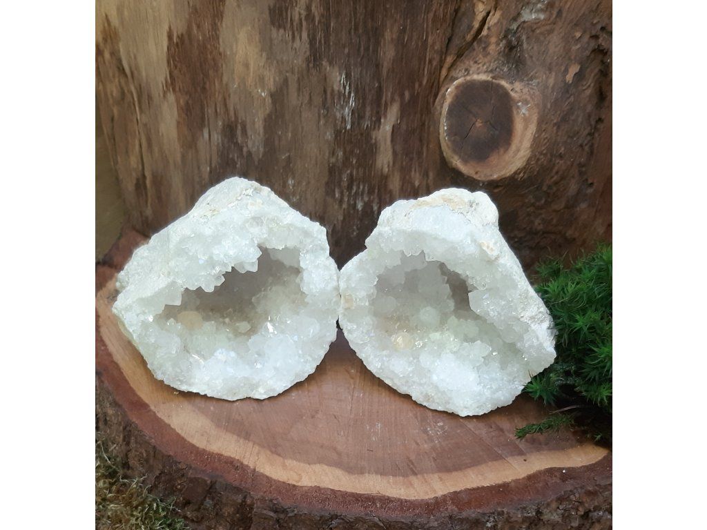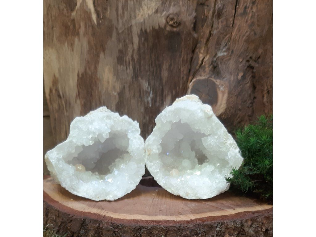 Objevte kouzlo jedinečného páru křišťálových geod, které byly původně jedním celkem – příroda je vytvořila jako jeden uzavřený kámen a při rozlomení se odhalila dvojice krystalových dutin, jež k sobě dokonale ladí. Tento výjimečný set je ceněný nejen sběrateli minerálů, ale také v energetické a duchovní práci.