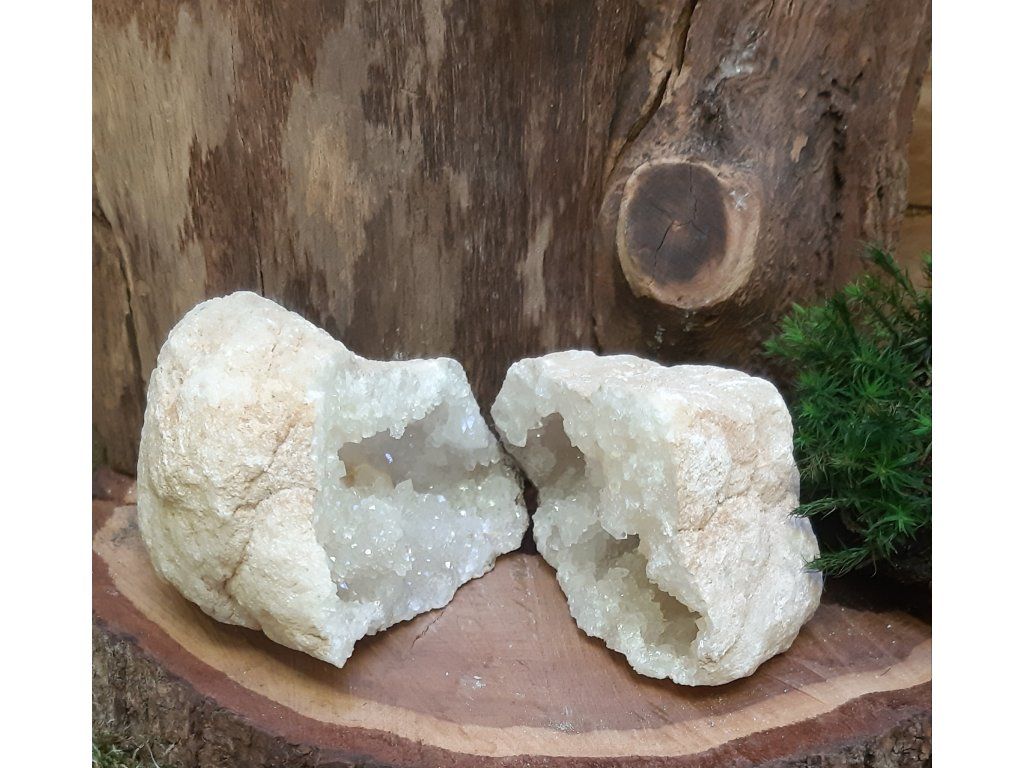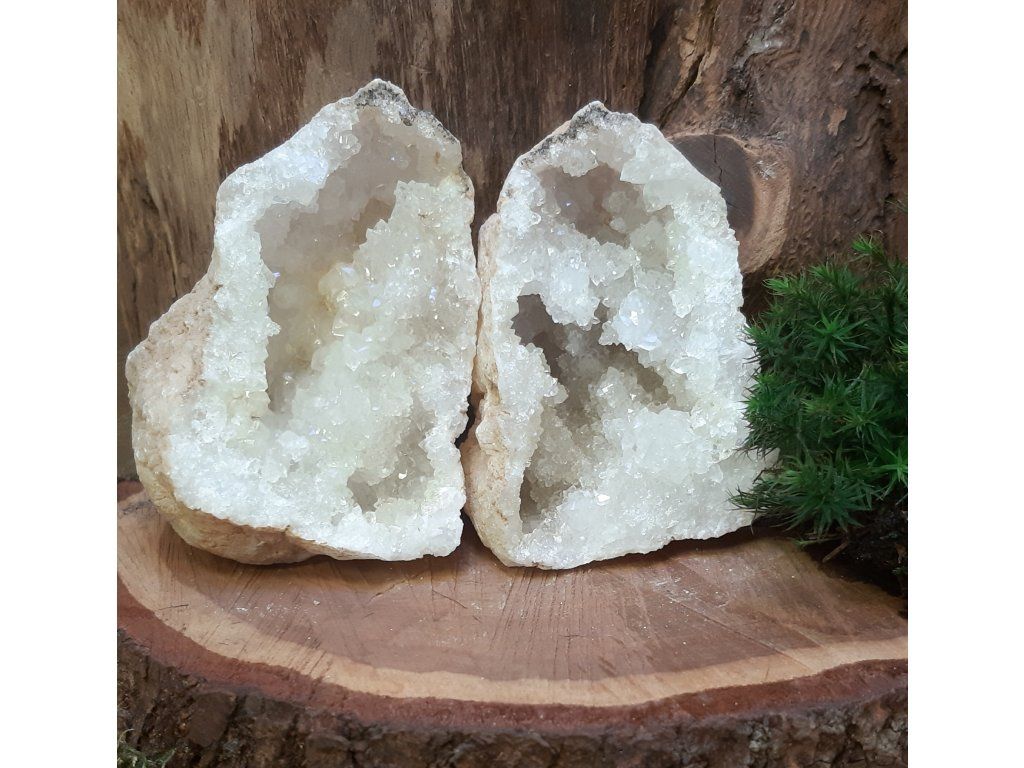 Objevte kouzlo jedinečného páru křišťálových geod, které byly původně jedním celkem – příroda je vytvořila jako jeden uzavřený kámen a při rozlomení se odhalila dvojice krystalových dutin, jež k sobě dokonale ladí. Tento výjimečný set je ceněný nejen sběrateli minerálů, ale také v energetické a duchovní práci.