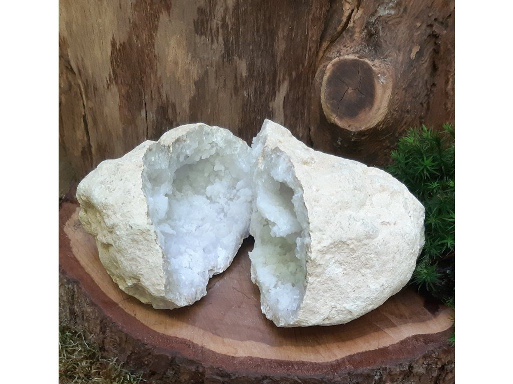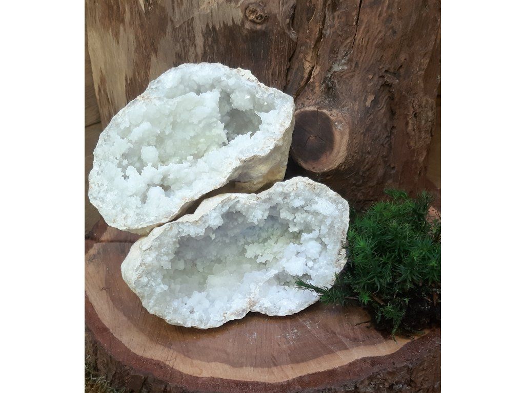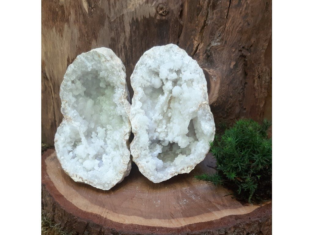 Objevte kouzlo jedinečného páru křišťálových geod, které byly původně jedním celkem – příroda je vytvořila jako jeden uzavřený kámen a při rozlomení se odhalila dvojice krystalových dutin, jež k sobě dokonale ladí. Tento výjimečný set je ceněný nejen sběrateli minerálů, ale také v energetické a duchovní práci.