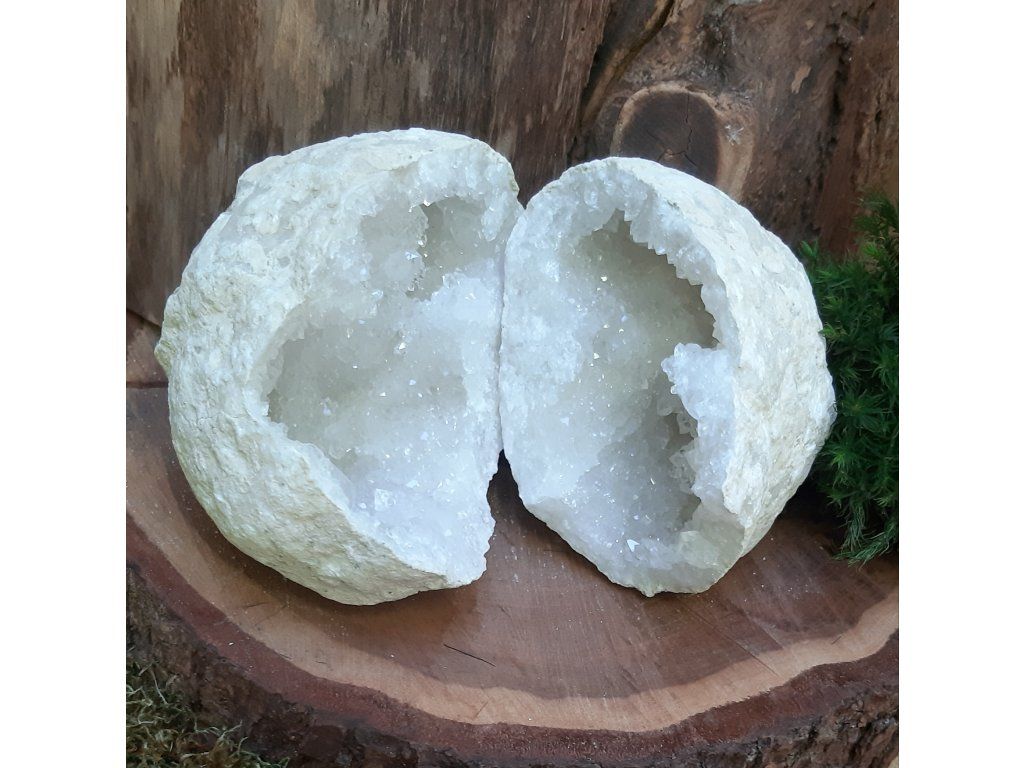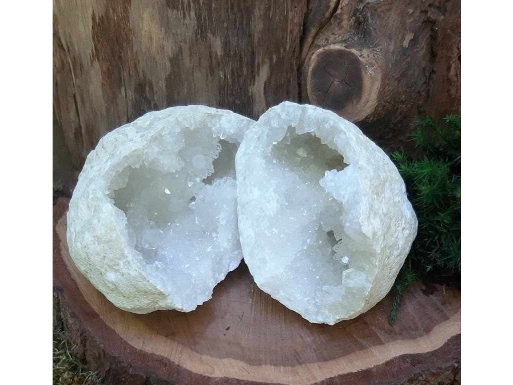 Objevte kouzlo jedinečného páru křišťálových geod, které byly původně jedním celkem – příroda je vytvořila jako jeden uzavřený kámen a při rozlomení se odhalila dvojice krystalových dutin, jež k sobě dokonale ladí. Tento výjimečný set je ceněný nejen sběrateli minerálů, ale také v energetické a duchovní práci.
