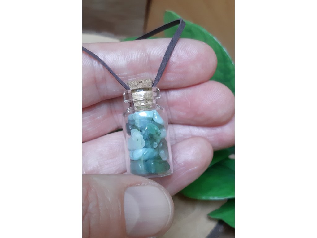 Smaragd přívěsek lahvička-na řemínku z kůže